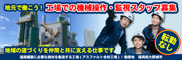 道路舗装に必要な資材を製造する工場内業務です。主に製造機械の操作、監視を行って頂きます。製造機械の操作、監視作業は室内で行います。転勤はありません。地元で活躍したい方、お子様のいらっしゃる方も安心してご応募ください。